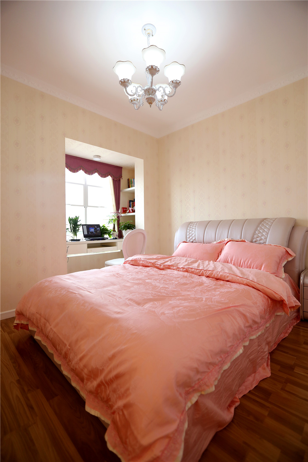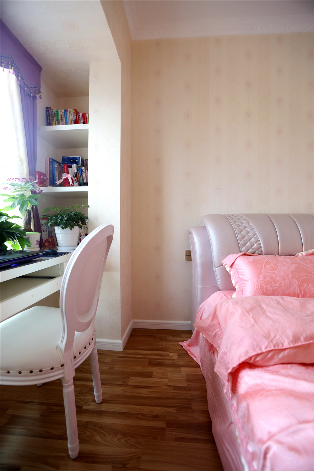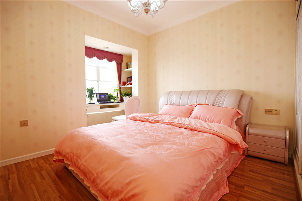主臥柔軟的大床、粉嫩的床單,在陽光照進飄窗時美到極致,溫馨的軟裝更有助于睡眠。將飄窗設計成工作臺,既可收納又可辦公,讓職場上的‘女強人’可以舒適的在家加班。
