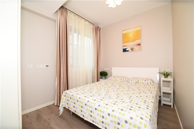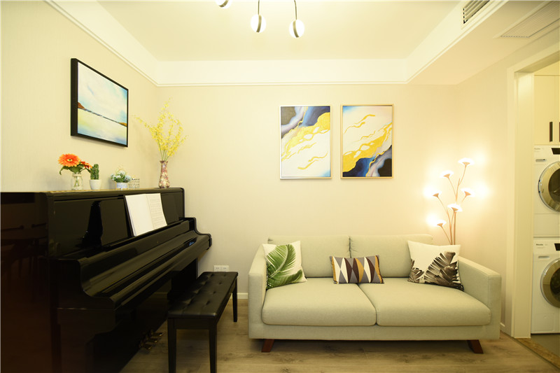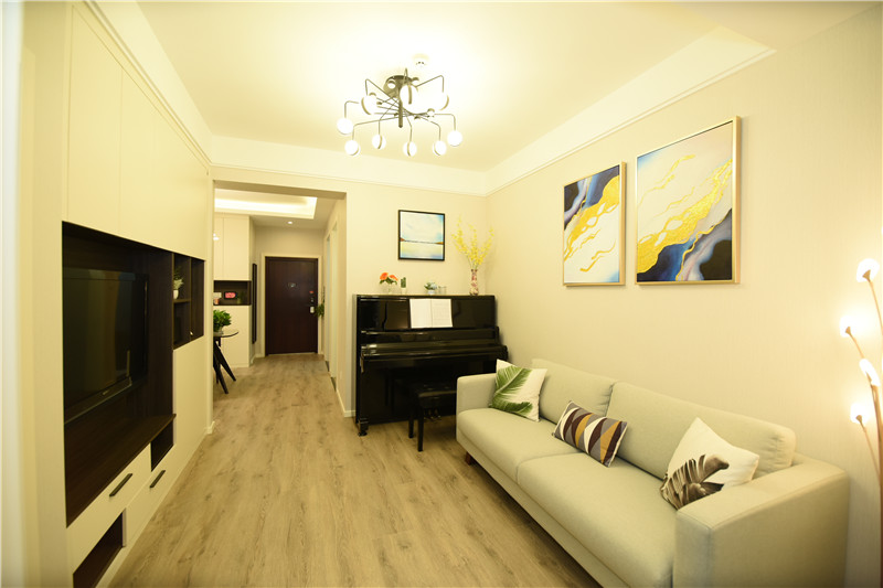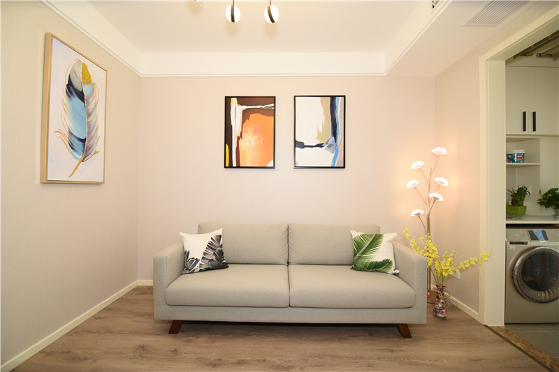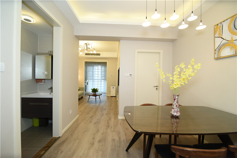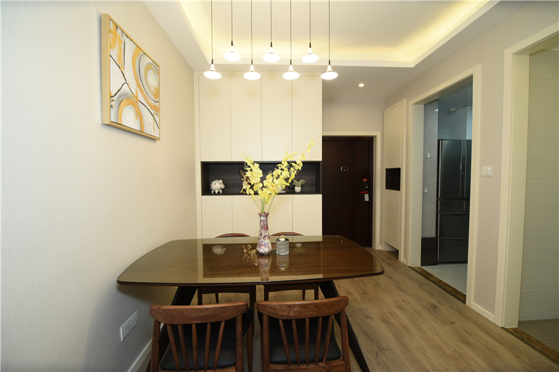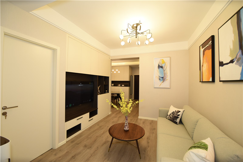 設計理念:在設計之初就考慮到做木色系現代簡約設計風格,希望能做出一個獨特的韻味出來??蛷d作為待客區域,要求簡潔明快大氣。在色彩描配上主要以淺灰色調為基礎,運用了藝術涂料,表現出簡單明亮的感覺,在墻面上運用了略抽象,冷色系的裝飾畫,散發出質樸的自然氣息和寬敞舒適的感覺。整體簡約,大氣,接近大自然。電視背景與主臥之間運用了裝飾柜作為隔斷,解決了儲物空間,也使電視背景表現了簡約時尚又不失材質的質感,柜門是烤漆工藝,明亮精致。主臥室是無主燈設計,四個雙頭斗膽燈承接了整個房間的燈源,分布均勻,代替了主燈,原墻面藝術涂料效果,墻面床頭背景運用深淺與原墻面對比,既是一個色系,也有主次之分,作為主人的私密空間,主要以功能性和實用舒適為考慮的重點,多用溫馨柔軟的成套布藝來裝點,同時在軟裝和用色上形成了統一。