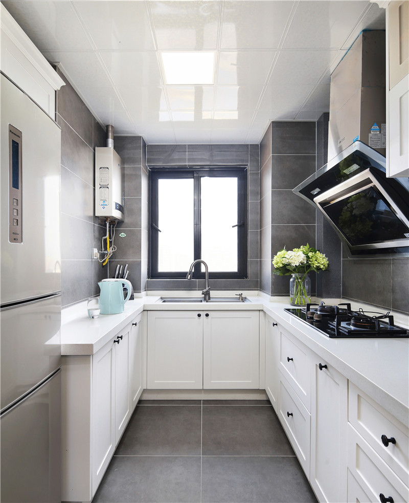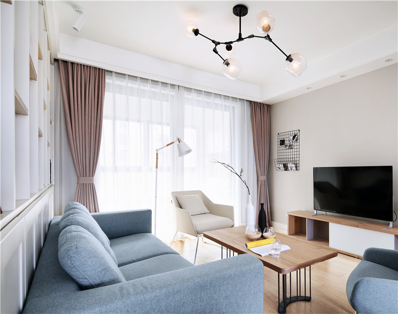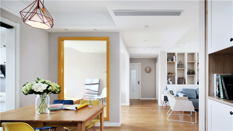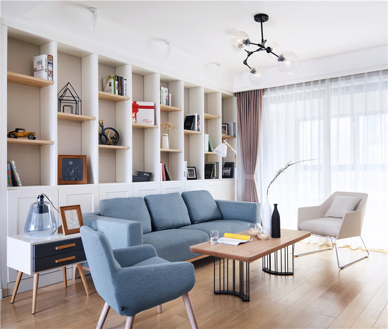 北歐風格家居設計,線條利落簡潔、干練,色彩多為單色,讓家中呈現一種自然的舒適、干凈之美。木質地板,灰色乳膠漆的墻面,淺藍色布藝沙發,金屬腿茶幾,白色的書柜,白色的單人沙發,一股濃濃的北歐范,更顯明朗與溫馨。 白色的塑料餐椅與原木色的餐桌搭配,現代與自然元素相結合。透明玻璃隔斷,黃色窗套,讓本不太大的餐廳顯得更加通透與明亮。多種暖色調的融合,讓餐廳氛圍立刻活躍起來。頭上的小吊燈不失可愛調皮,也讓用餐生活更有情趣。敞開休閑空間,木質榻榻米配上升降臺,品一杯茶,閱一本書,讓家居生活輕松隨性。 廚房色調上以黑白色為主,黑與白是極簡主義的代表色。深灰色水泥磚,白色櫥柜,整個廚房空間線條簡潔,黑白對比明確,讓人看上簡潔干凈的同時卻帶來另一種低調的寧靜感,沉穩而內斂。