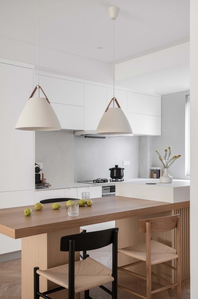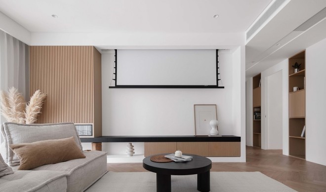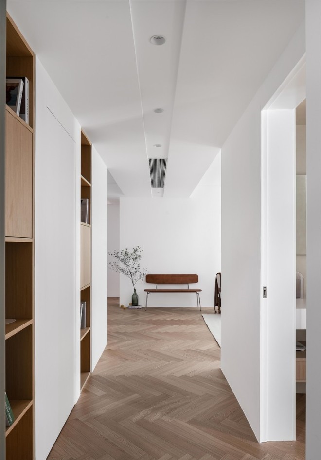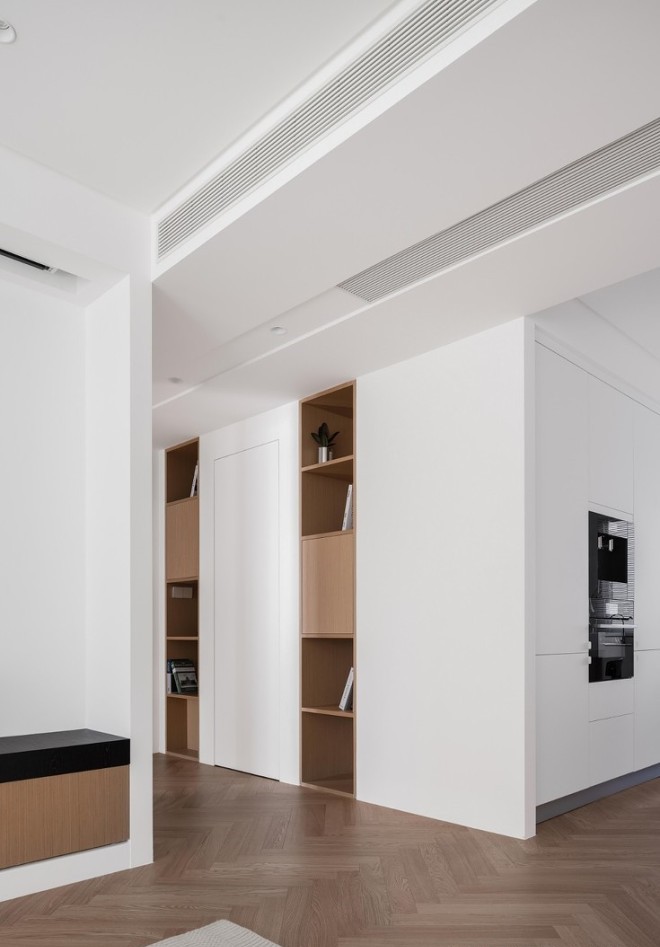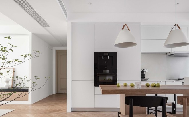 設計說明:這是18年的設計案子,房主是三口之家,是一個對設計和生活都很注重的知識青年,有著很好的審美和品味。平時比較安靜,閑暇時間喜歡看書和影視。整屋改動最大的是做了衣帽間。風格上結合屋主喜歡的樸實簡潔,選定北歐極簡。整套住宅大面積的采用了素雅的原木色與白色,營造出自然、安靜舒適的居住環境。入戶走廊鞋柜采用三段式分化設計,利用隱形門巧妙隱藏了大收納的衣帽間入口,讓進門不再是原始的門洞堆積,繁忙雜亂??蛷d采用全吊頂無主燈設計,背景墻的白色、暖色的沙發與木色的電視柜,簡潔黑色的木飾面,營造出干凈整潔的家居氛圍。開放式廚房設計增加了空間的通透性,融入了蒸箱及烤箱的西餐功能,讓中西廚文化有了面對面的交流。