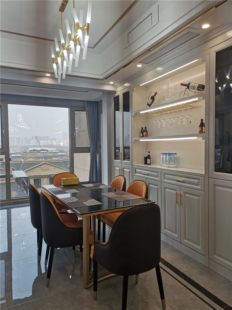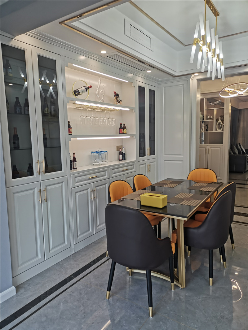 餐廳的燈光很重要既不能太強又不能太弱,所以設計中燈光則以溫馨和暖的黃色為基調,頂部做了簡單的吊頂。在餐桌的墻面上擺放一些裝飾畫,以達到增加餐廳的情調。