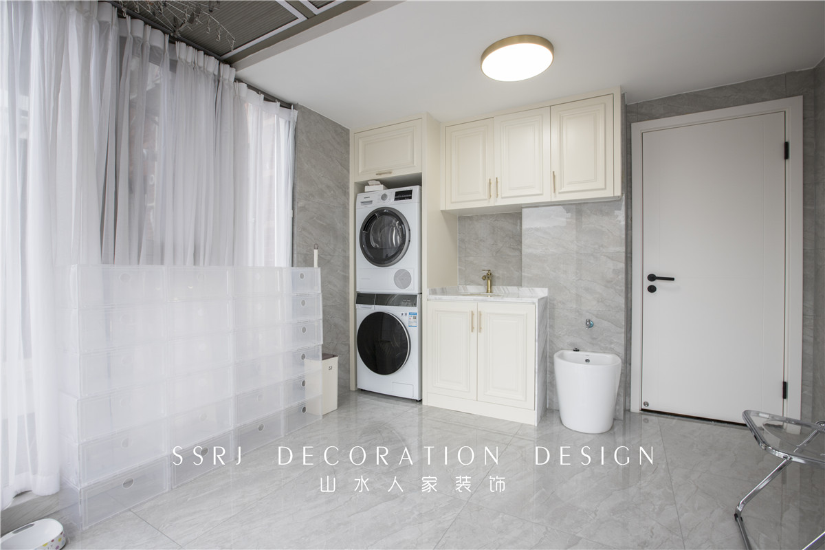 陽臺在滿足基礎洗衣功能的同時,保證了較高顏值,實現洗衣機和烘干機的疊放。旁邊還帶有一個洗衣池,地面也稍微抬高了一些,防潮排水也比較方便。陽臺擁有極大的休閑空間,閑來無事,放一張躺椅或是瑜伽墊,享受遍布全身的日光浴。拉開窗簾,屋外的美景盡收眼底。