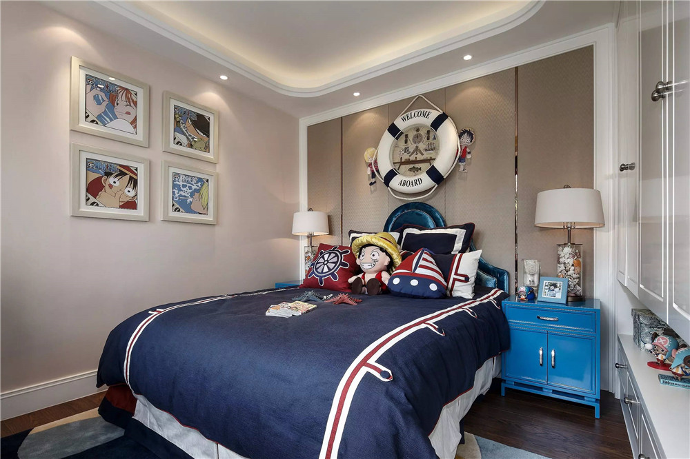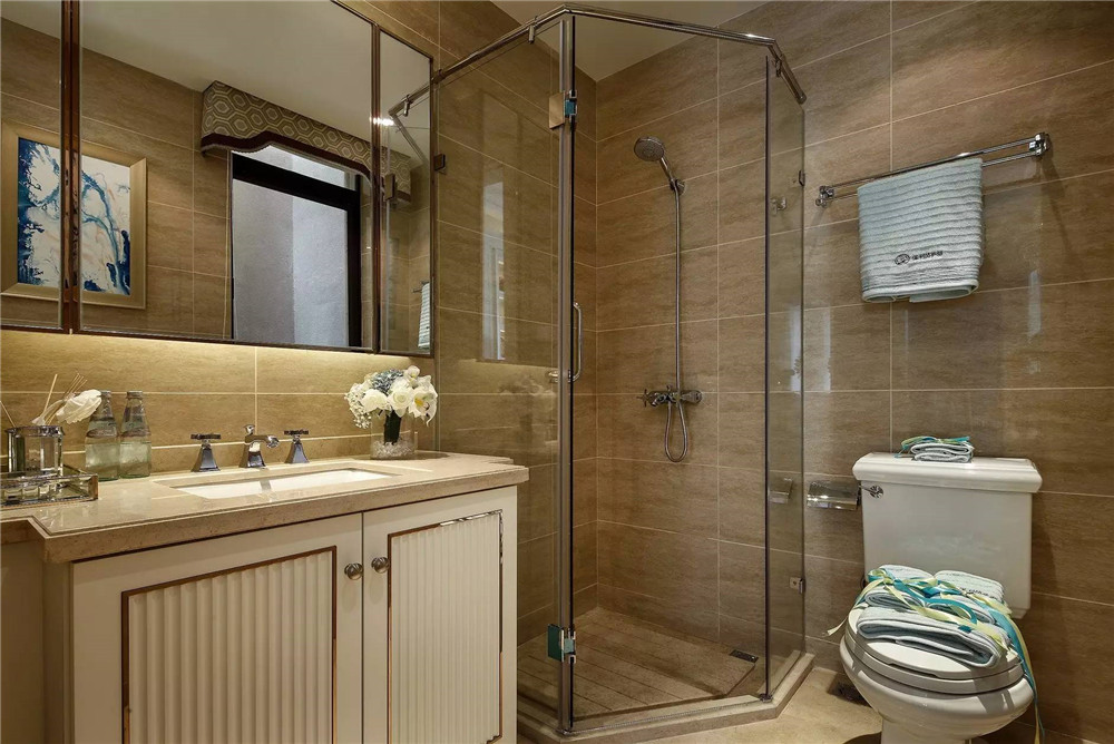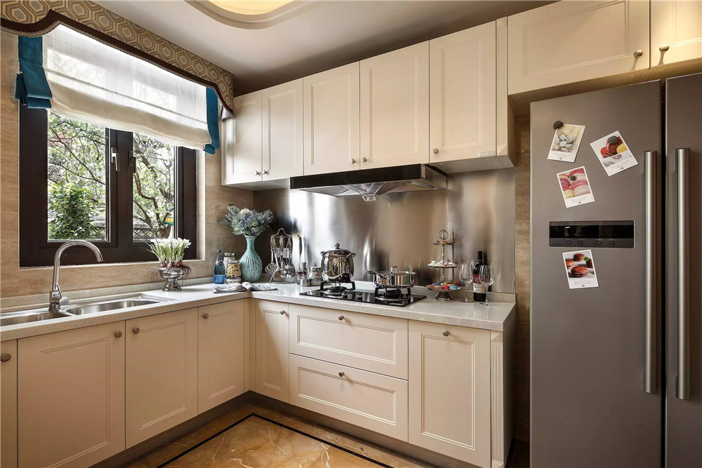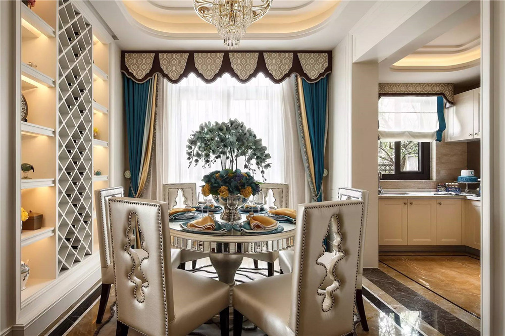 業主喜歡古典美式風格,凸顯優雅高貴的格調,要求在彰顯風格的同時注重舒適性。設計師大膽突破風格界限,在表現形式上追求多樣化,把美式的質樸,歐式的優雅和法式的浪漫,以簡約的線條代替復雜的花紋,采用更為明快清新的顏色,既保留了古典歐式的典雅與豪華,又更適應現代生活的悠閑與舒適。為了使整個空間更為輕松而不沉悶,我們在墻板空間結合了較為柔和的米色,軟裝局部選擇了較為跳躍的孔雀藍,通過對燈光的布置,增加了室內采光以及對氛圍的營造??蛷d的面積比較大,配合整體效果,墻面設計墻板來增加整體的圍合感整體深淺對比,通過家具及軟裝的搭配使空間更加飽滿也更有生活味道。餐廳區域大氣充滿藝術氛圍的就餐環境,讓人體會到空間的張力,多以開放格的形式,給整個空間增加了呼吸感,淺色的色調不會顯得那么悶。臥室地板選擇是色澤較為深厚的棕色,給人較為穩重古典的感覺。廚房打開做開放式,空間更加通透。廚房餐廳整體感更完整。