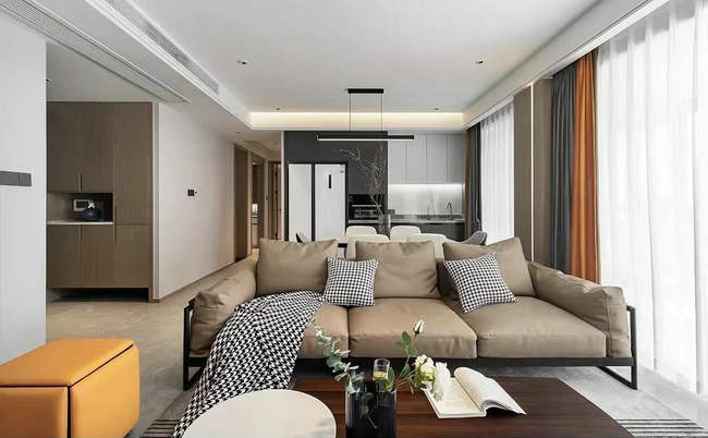 設計師根據整體戶型及業主需求,針對性地做出如下調整:(1)門廳處做抬高處理,借此做出獨立的玄關落塵區;(2)打通廚房和餐廳處的墻體,做了開放式設計;(3)客廳區域重新布局,在原陽臺設置了茶室和花園,功能性更足:(4)衛生間做了干濕分離,借助隔板有限阻擋視線;(5)主臥重設開門口,在里面設置了衣帽間和主衛空間;(6)設計次臥+書房的格局,滿足業主的各種娛樂需求。