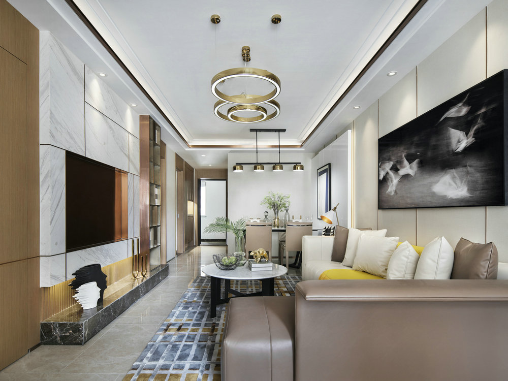 玄關處做了抬高處理,目的在于做出獨立的玄關落塵區。起居室就可以席地而坐,充分符合日式風格。值得注意的是,吊頂還做了旋轉花盆的設計,茂密的枝干隨風搖曳,沙沙作響。