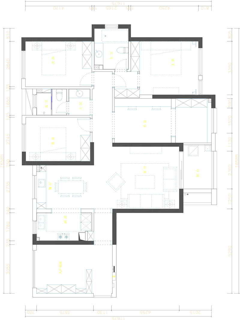本案為三房兩廳,南北通透??臻g較為規整,進門沒有獨立的玄關區域,且聯通著窄長的餐廳區域。將餐廳劃分出部分空間,設計了一個開放式的書房,滿足了女主人在家上網的需求,又增加了較多的儲物空間,補給進門較為小巧的鞋柜。餐廳卡座的設計,在增加儲物的同時,也增添的趣味,同時釋放出了更大的通道便于出入廚房及書房。冰箱移至餐廳區域,讓廚房的空間更大化的利用,更好的滿足女主人對于臺面和儲物的需求。