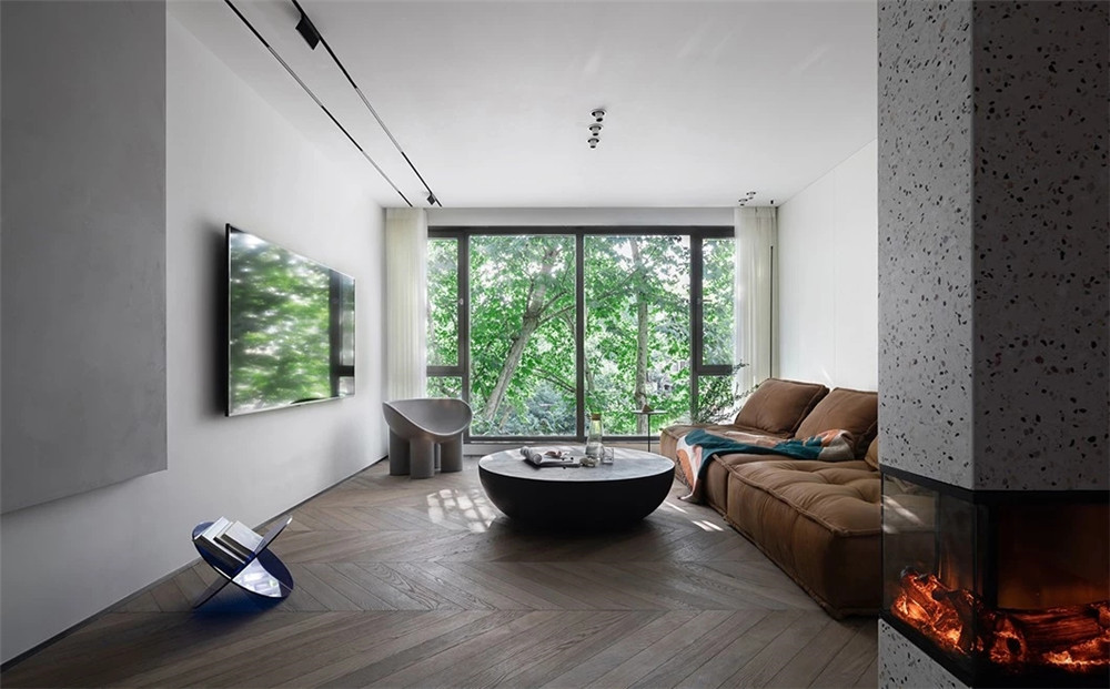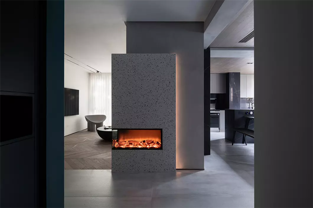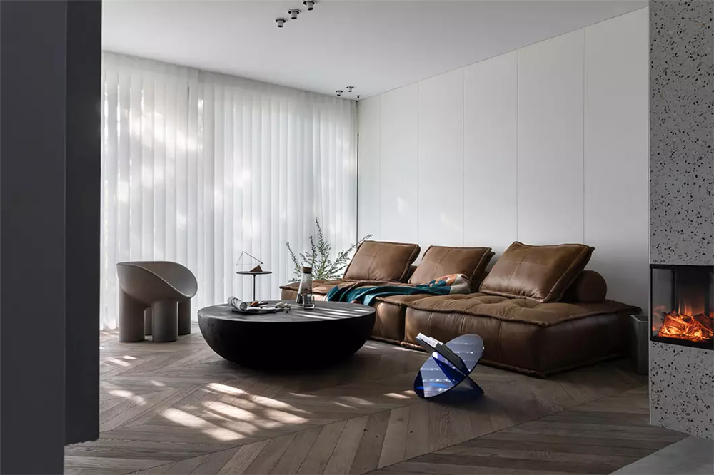 本案的主題為現代極簡輕奢風格,客餐廳過道采用無吊頂的造型面,客廳燈光主要為明裝筒燈為主,也比較符合客戶的最初的一個要求,喜歡家里面一切從簡,但是帶一點點點綴的軟裝以及一些亮點,所以進門玄關處,設計了電磁霧化的壁爐設計,也是整個房子最有亮點的一個地方,為家里的氛圍提供了大氣的環境。體現精致,在墻面造型上追求簡潔。加入軟裝的點綴,使得整個空間非常有層次感。