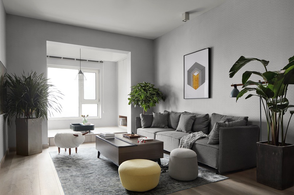 原有空間相對閉塞,拆掉不必要的墻體,整體做成開放式。這樣一來不僅加強了客廳縱深感,還使得空間通透明亮??昂煷钆浒咨喓?,避免窗臺過于單調,同時起到一定的裝飾性能。