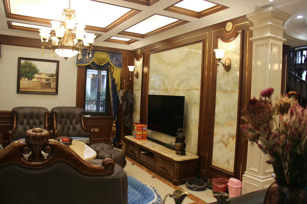 全房層高接近4.4m,如果是單純現澆,上下兩層的呈現效果欠佳。于是給一層挑空給予支持,有效拉伸空間視覺。在優雅吊燈的襯托下,客廳氛圍感直接拉滿。