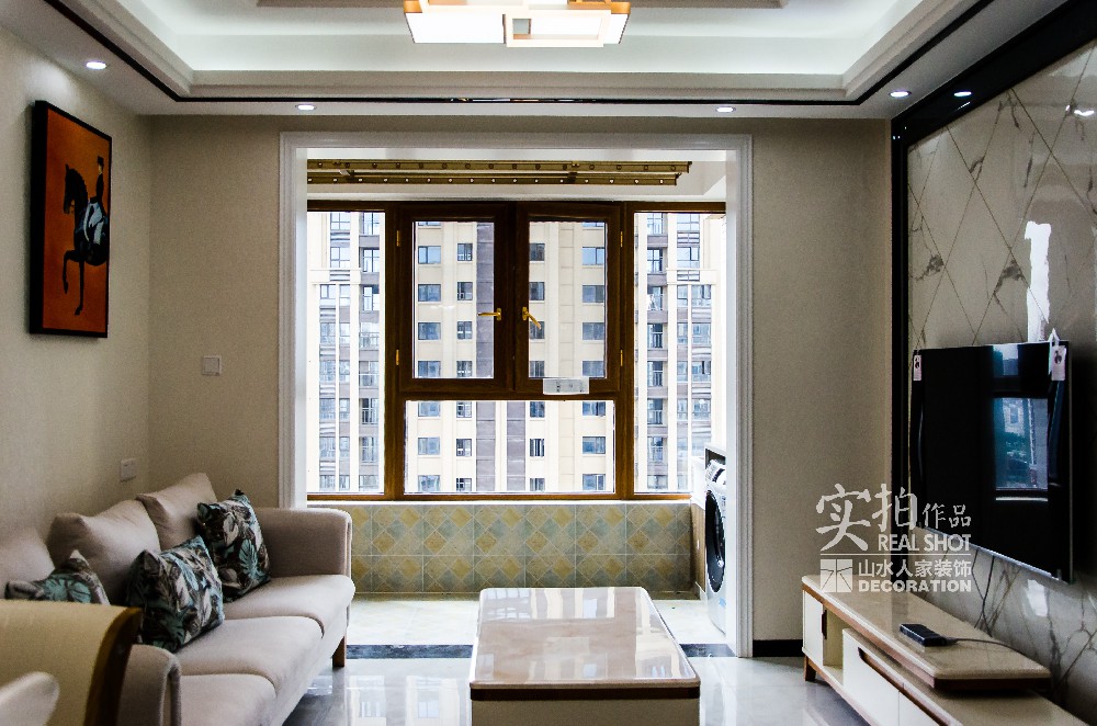 本案戶型方正,南北通透,空間格局相對不錯,為了強化空間的功能性,對房屋結構做了部分升級:(1)打通客廳和陽臺,增加采光和生活面積;(2)主臥采用格柵隱形門,同電視背景墻做了協調聯動;(3)將廚房生活陽臺擴入衛生間,形成獨立淋浴區,相應解決衛生間使用舒適度問題。