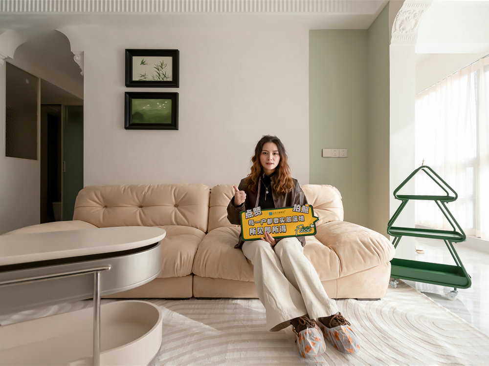 客廳家具擺放較為常規,但舒適感難以掩藏。柔軟的靠背沙發隨意地躺在上面望向窗外,頓覺心情開闊不少。搭配充當跳色的靠墊,呈現鮮活的生活狀態。魚肚白茶幾踏實可靠,收納力強,邊角還做了柔化處理,避免著急出現磕碰的狀況。