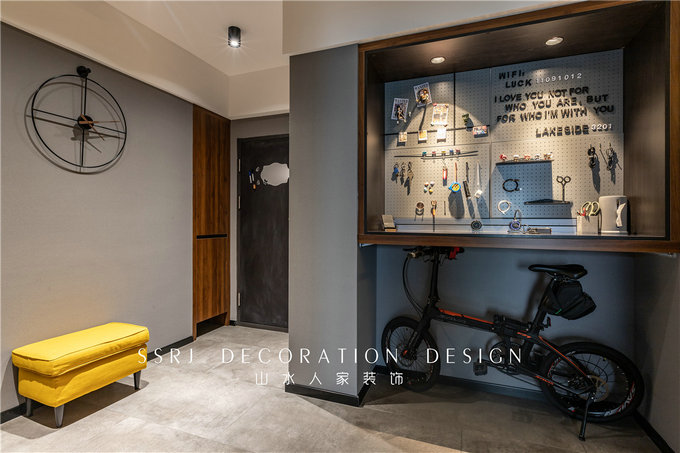 入戶定制玄關端景,實木材質搭配金鹿擺件,成為主要的空間亮點?!奥埂蓖暗摗?,寓意福祿雙全,生活富足。其中白色鞋柜和黑色格柵形成鮮明反差,結合長條筒燈,更添幾分時尚感。