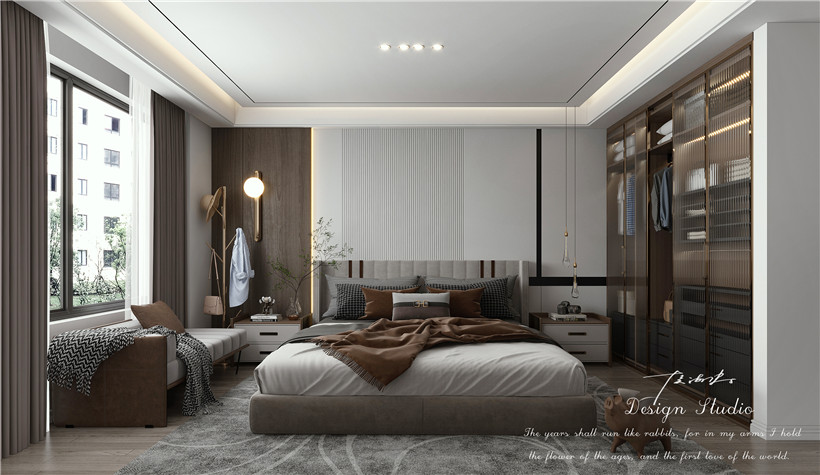 主臥墻面用到藝術漆,配合豐富的吊頂造型,簡潔大氣又耐看。床板用木飾面修飾,搭配米色床頭,給人以舒爽的直觀感受。床邊用氛圍燈光點綴,借以鋪陳出舒適睡眠氛圍。