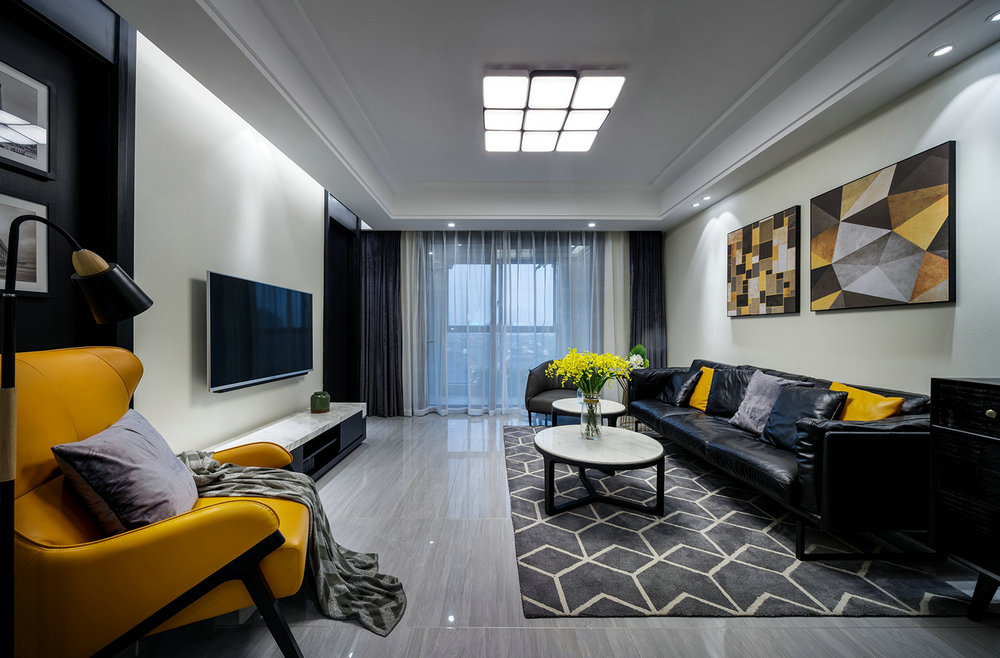 采用開放式布局打破空間界限,地面通鋪啞光磚配上大塊地毯,在視覺上延伸空間感??蛷d主色調以珍珠白為主,營造靜謐氛圍的同時,用少量高飽和度色彩,如黑色、自然色等進行點綴,形成強烈互補。