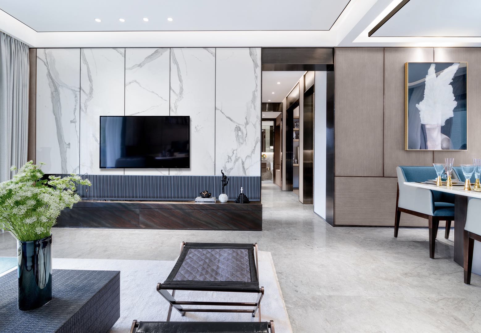 客廳頂部是無主燈+懸浮頂的設計,拉伸層高的同時,讓整個空間看起來非常簡潔。地面通鋪柔光磚,同整體背景保持協調性,沙發區鋪設米白色地毯,創造出簡約優雅的空間感。