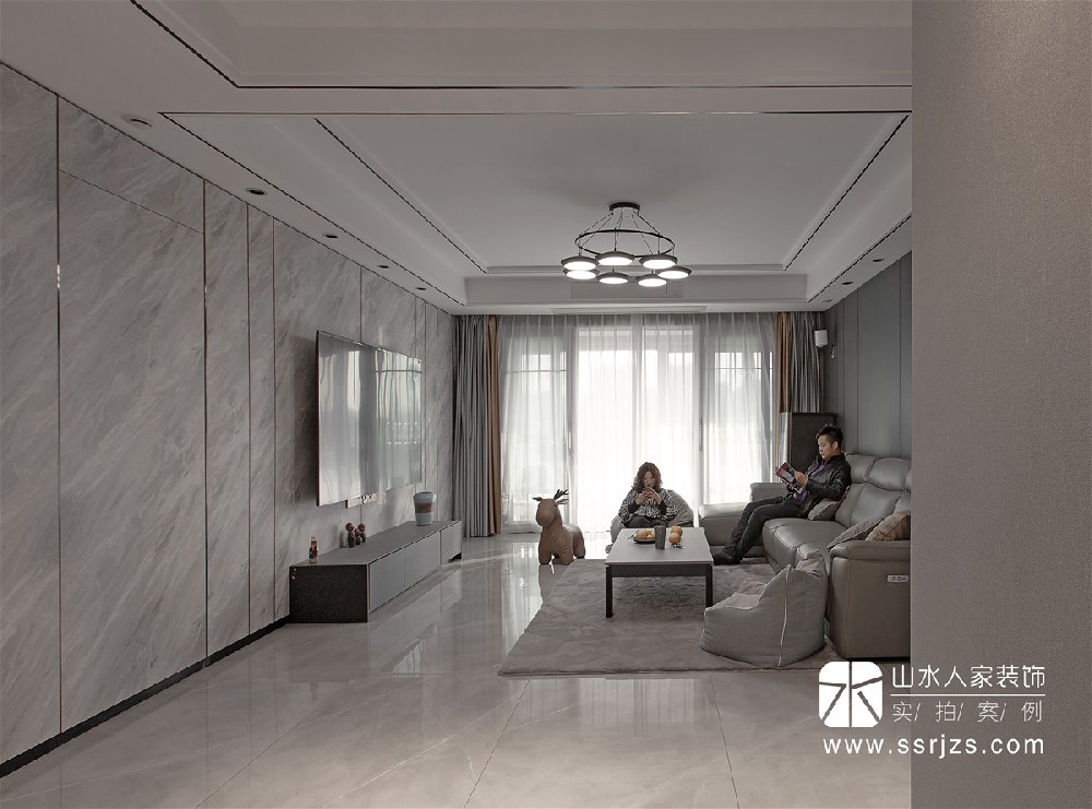 整面定制白色懸空電視柜,底部留空減輕厚重感。電視嵌入柜體中央,隱形收納柜保持整潔。一側增設開放式隔層,內置裝飾品與收納盒,兼具功能性與美觀性。