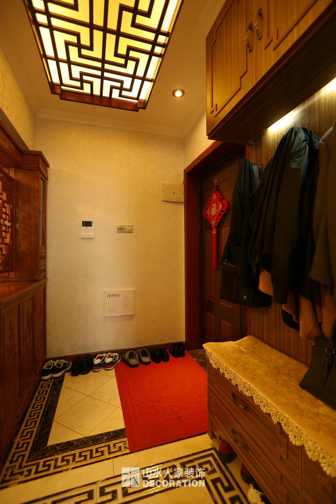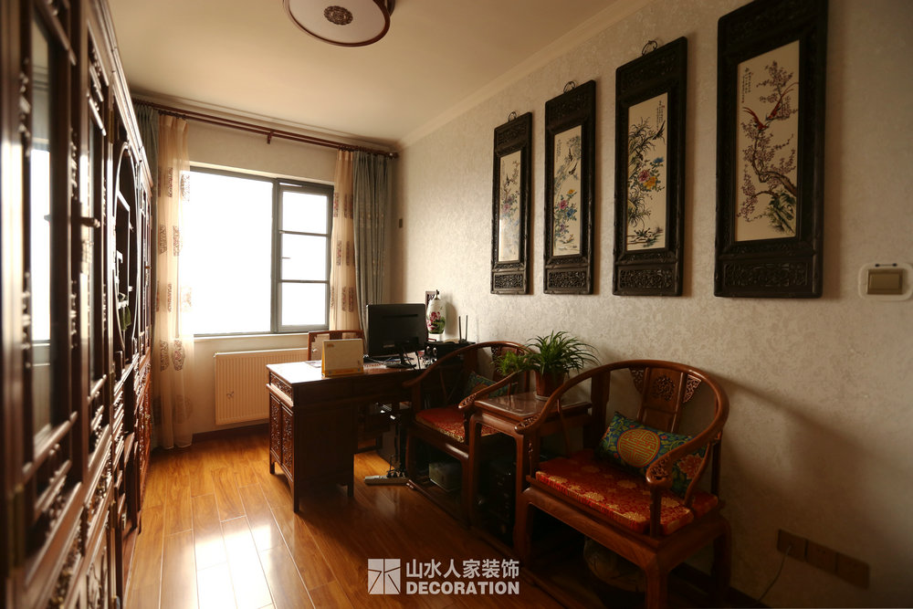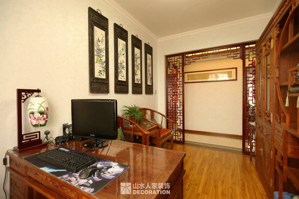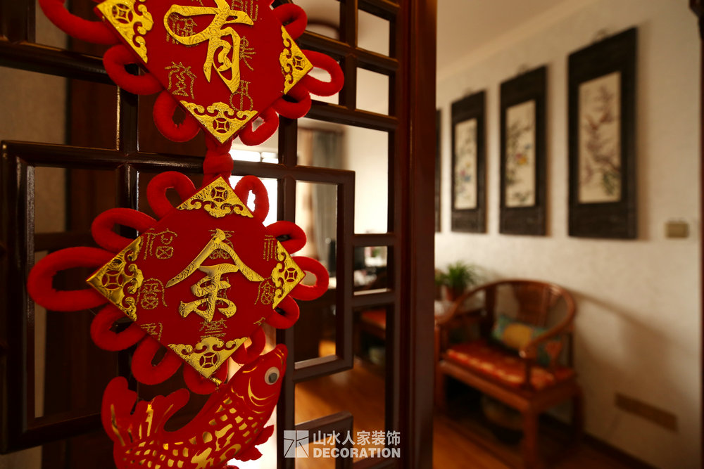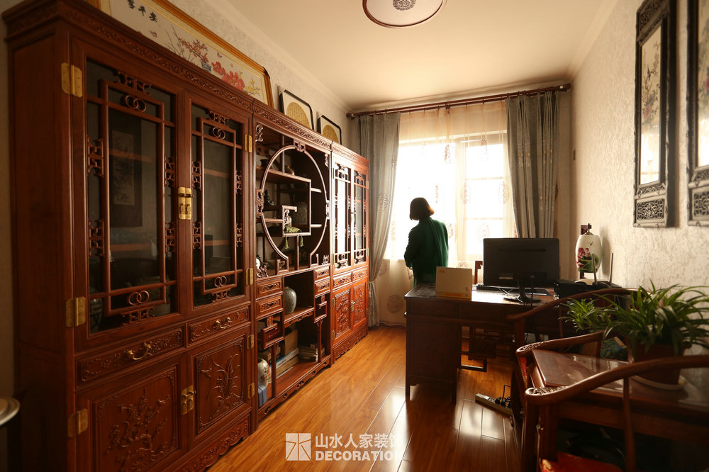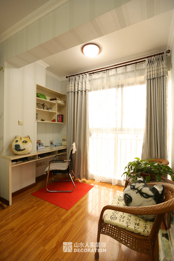 平面入戶是正對著一條狹長的過道,站在門口一眼把家里一望無余,所以在溝通的過程中在入戶的對面加上屏風隔斷的裝飾柜,既增添了儲物和美觀的功能,又做到了柳暗花明又一村的神秘感。書房在過道的一邊,狹長的過道兩邊分布了四個房間,考慮到采光跟視覺的開闊性,用雕花隔斷打造開放式書房,充分的讓空氣對流,合理的引進采光,視覺上拉大開放空間。小孩房把原始的陽臺包進來,整面落地玻璃在陽光最好的南邊,坐在窗邊看看書,喝喝茶,曬曬太陽簡直是美極了。原本開門對著過道的主臥洗手間,往主臥室平移了一扇門的空間,既保證了主臥衣柜的儲物量又避開了衛生間門對大門的弊端。整個柜子全是現場工人師傅采用公司最具環保的兔寶寶免漆板純手工制作,內斂不失細致,美觀卻不繁瑣