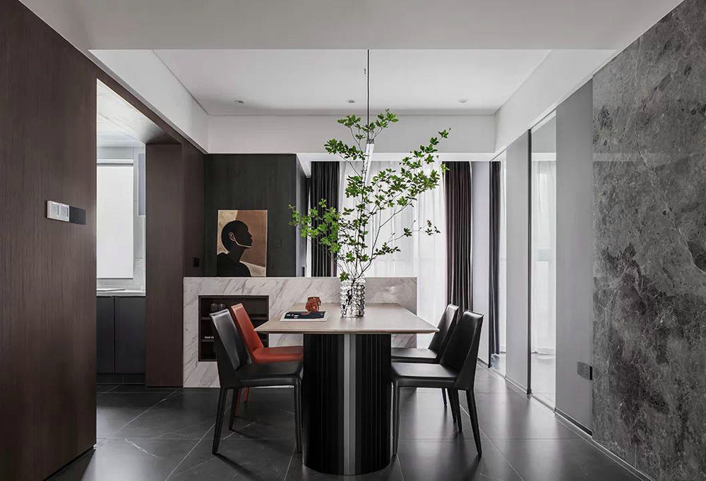 餐廳選用設計感極強的巖板餐桌,搭配同款式餐椅,打造出一個舒適用餐環境。墻面錯落懸掛裝飾掛畫,點綴有亮黃色與紅棕色的色塊,質感碰撞提升了層次。