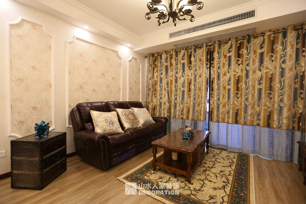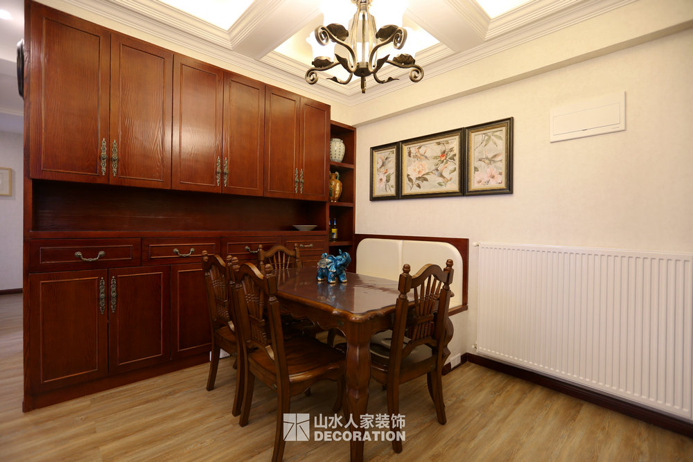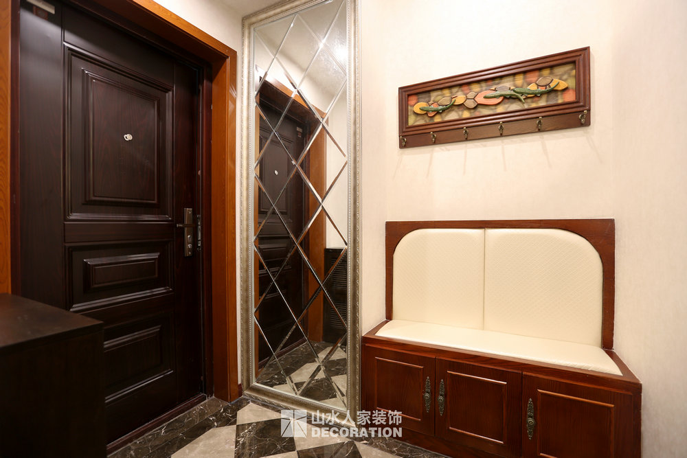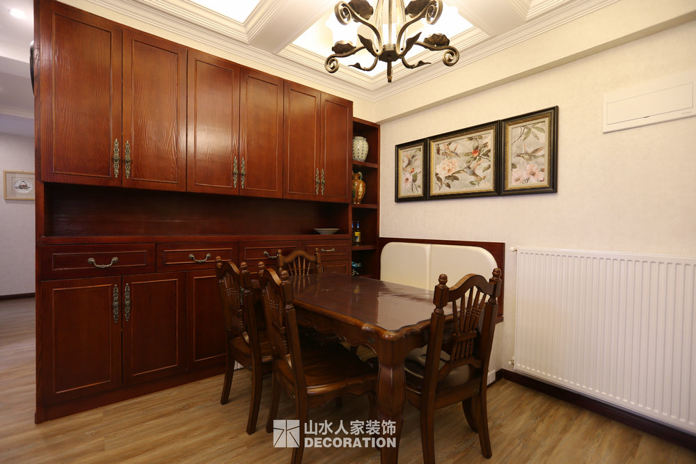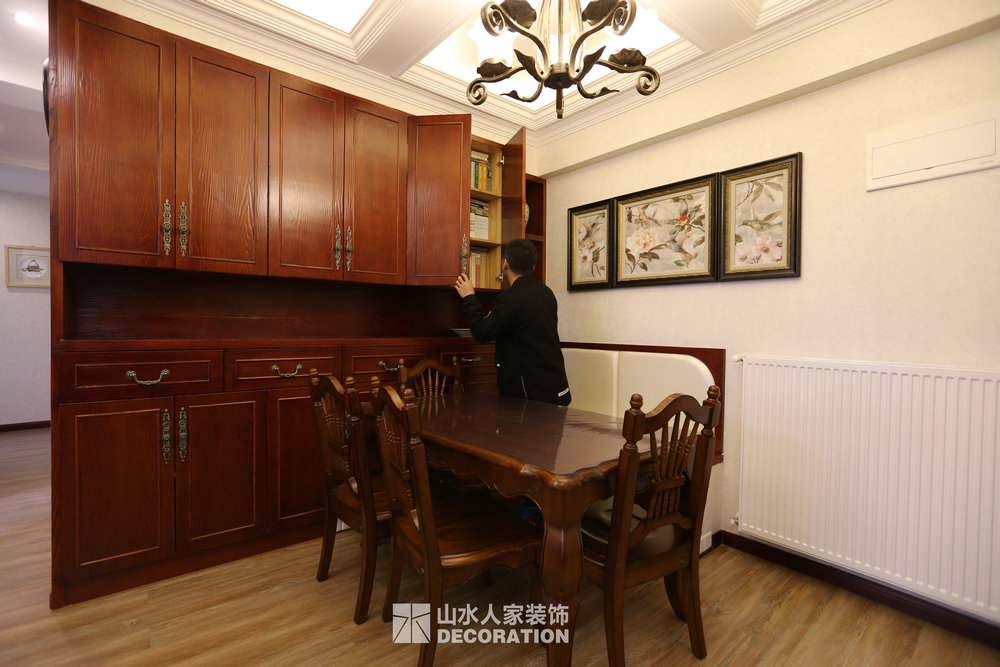 ③設計說明:此戶型是一個常規的三室兩廳雙衛雙陽臺的戶型,戶型方正,南北通透,采光通風都挺不錯。和業主溝時,女主人說希望有一個衣帽間,男主人則說需要大面的書柜和書房。于是在方案設計的時候,特地將主臥原本衛生間的地方劃分了一部分做成了衣帽間,然后將主臥的陽臺做成了一個半開放式的書房。其他的區間則遵循了原始的格局,只是在細節上做了很多優化,再一次見面溝通時方案得到了業主的一致認可。而風格上我們則選定了具有明晰線條、優雅得體有度的古典美式,恰如業主第一次給我的感覺一樣。
