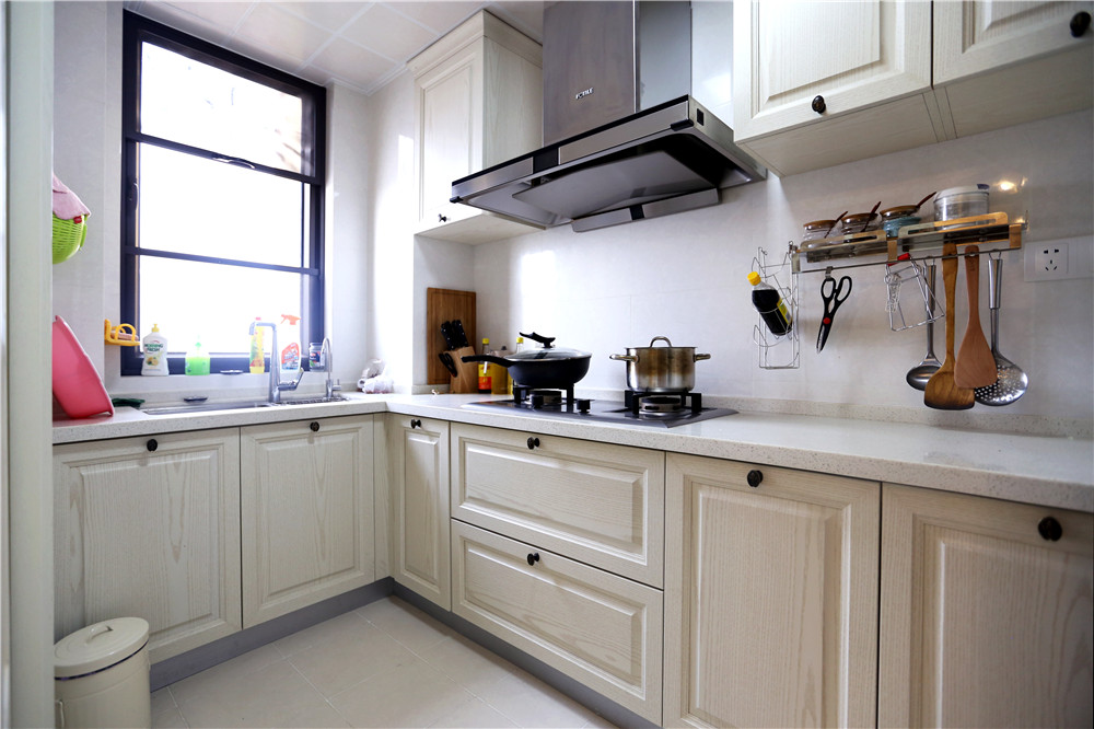 廚房的設計比較簡單,因為收納空間多的可怕。頂吸式的抽油煙機造型大方,排煙效果較好。