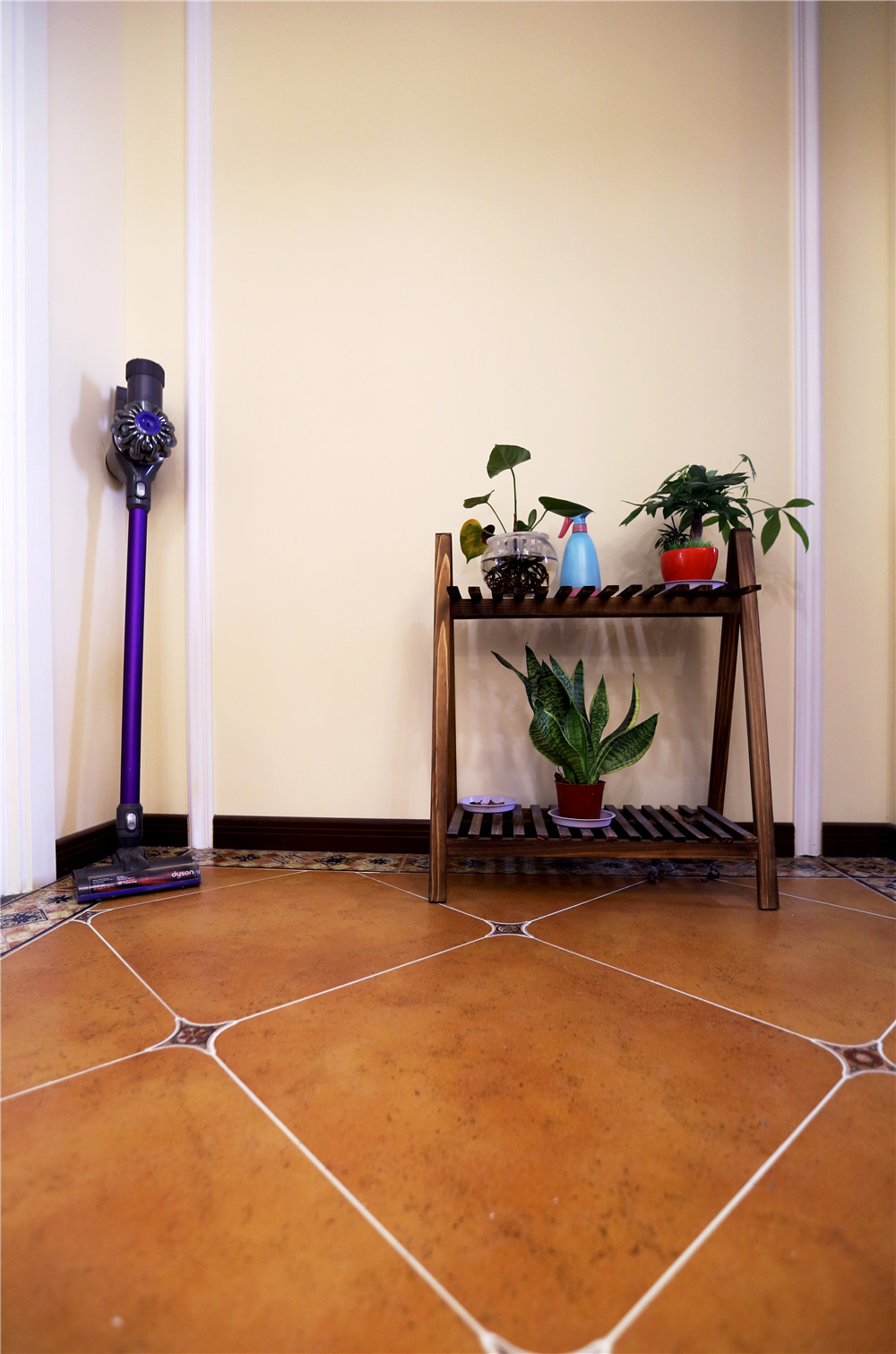 褐色仿古磚,讓你一進門就享受到“回歸”的感覺。左側的鞋柜客串了鞋凳的身份,與衣柜收納三位一體。