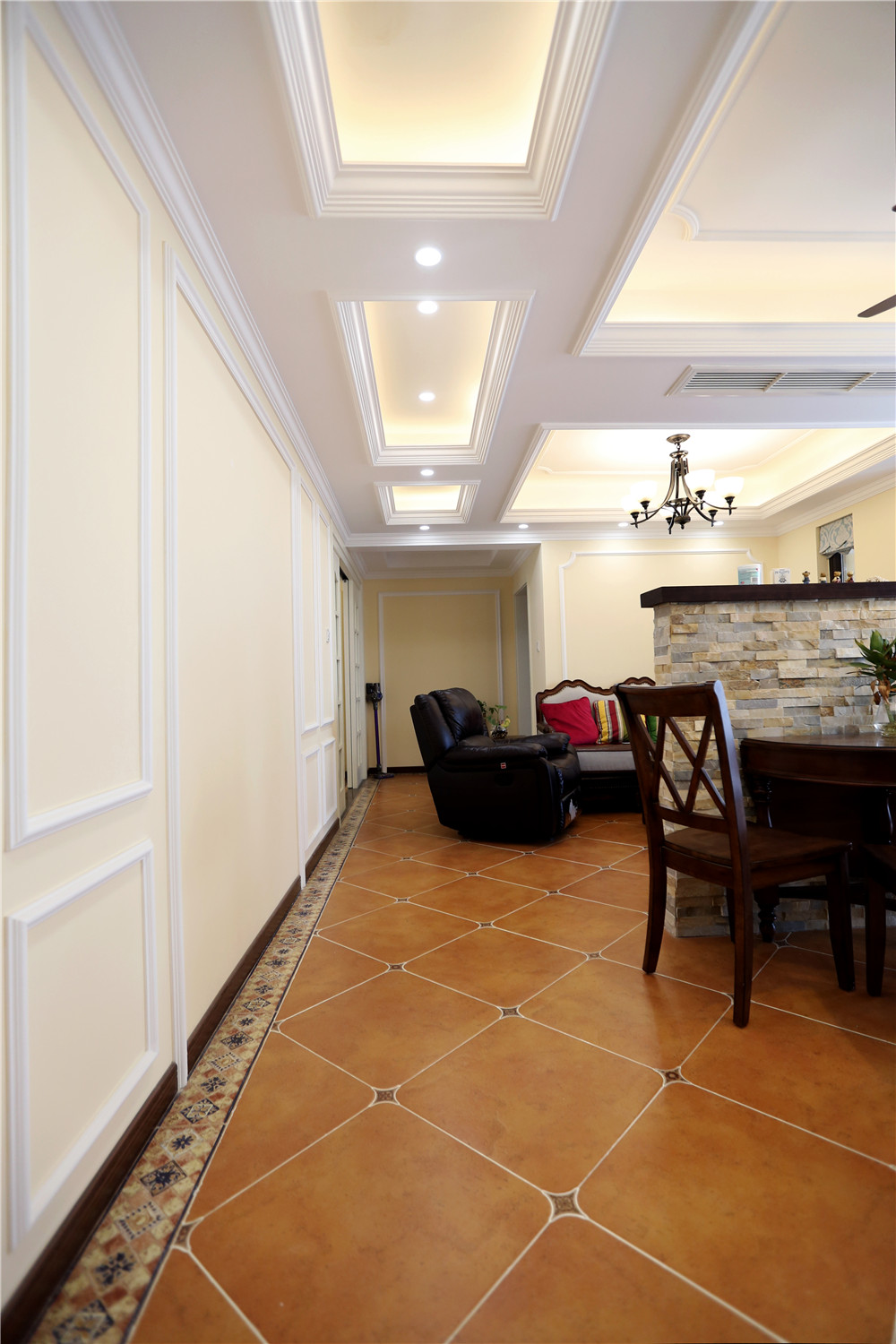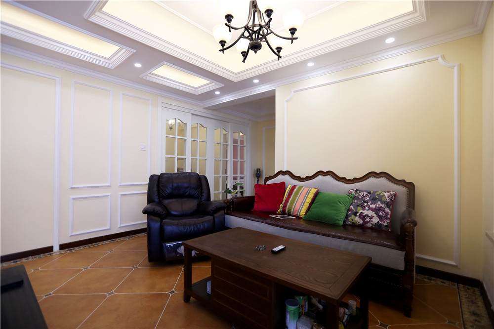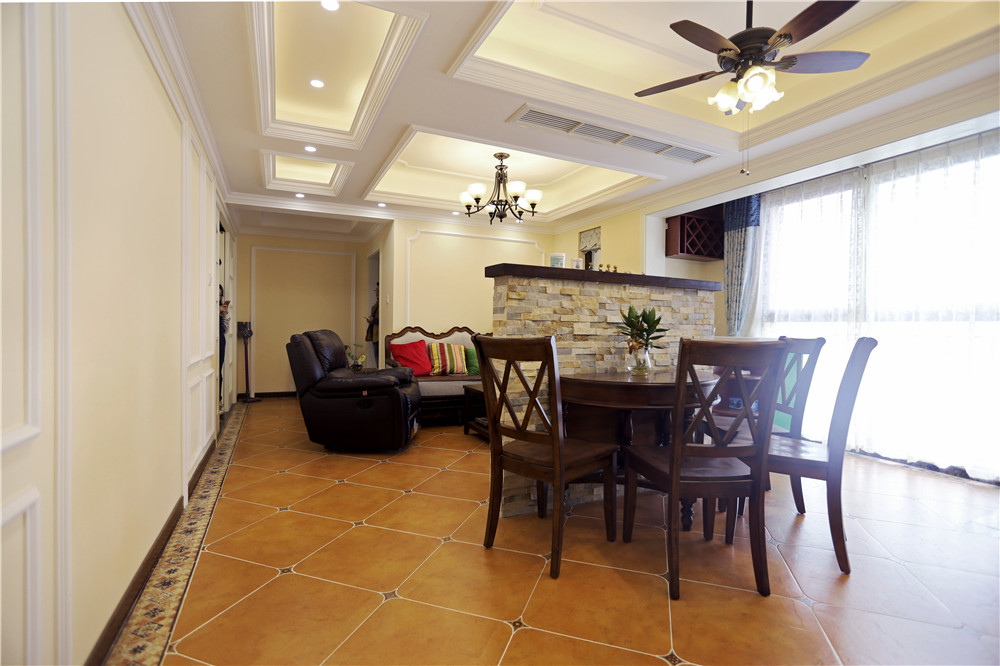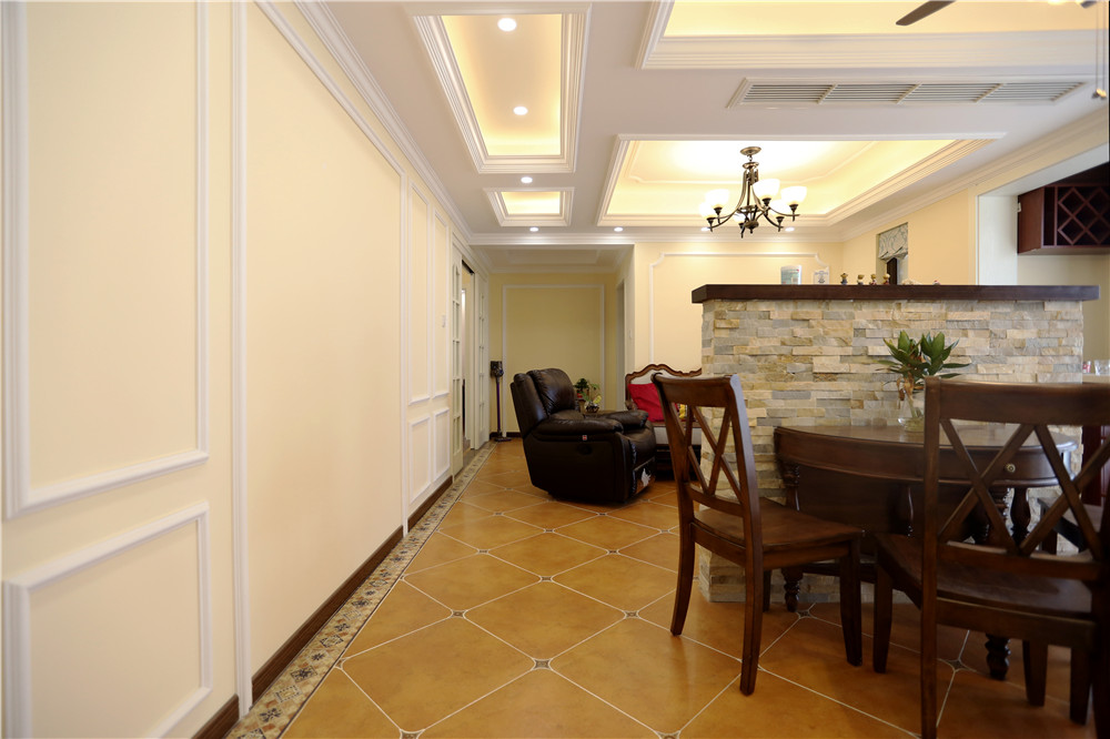 這是一套標準的美式風格設計,傳統的美式深咖色家具,米白色墻面共同營造出了一種悠閑安靜的居家氣氛。