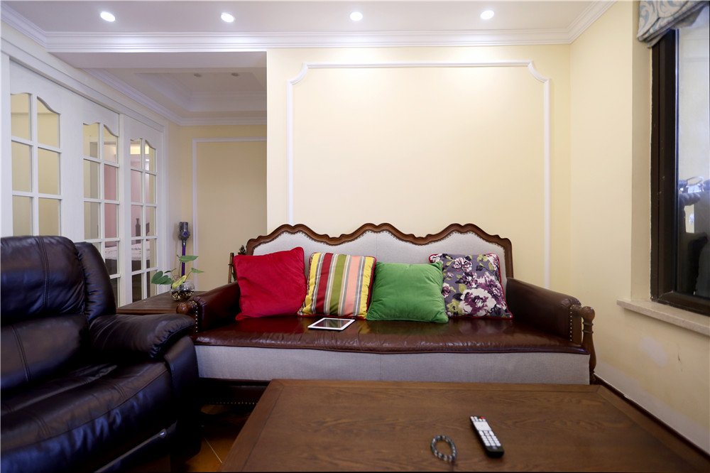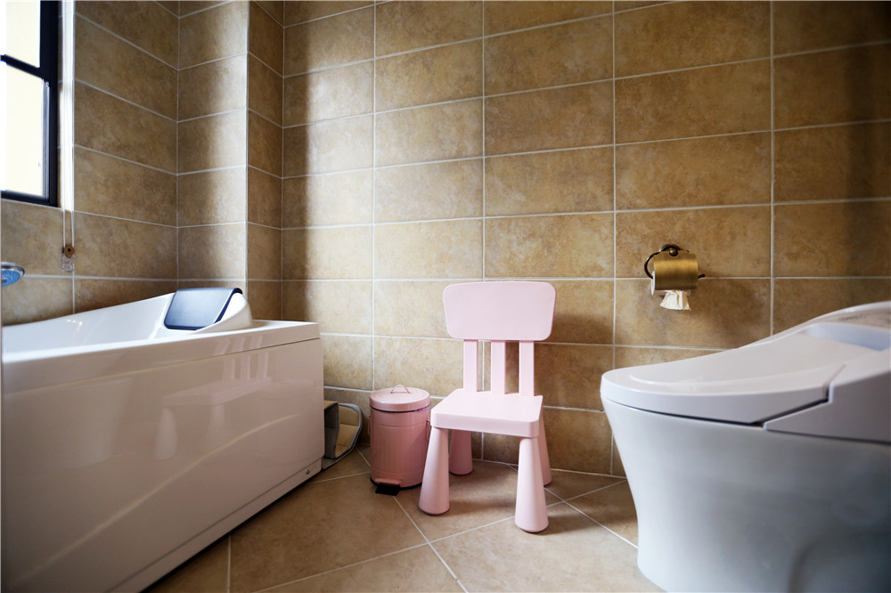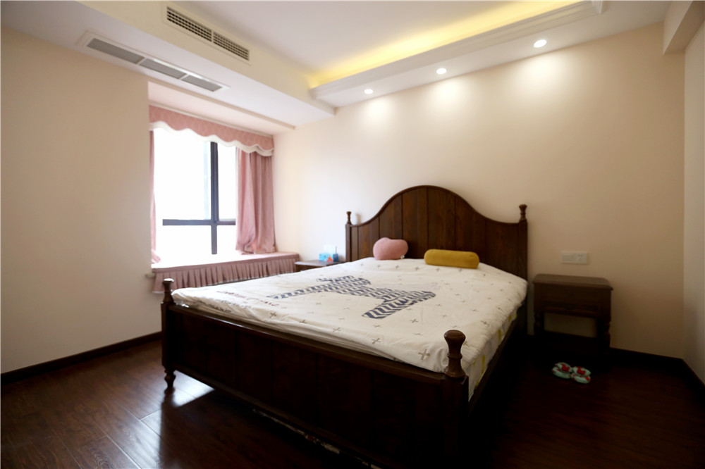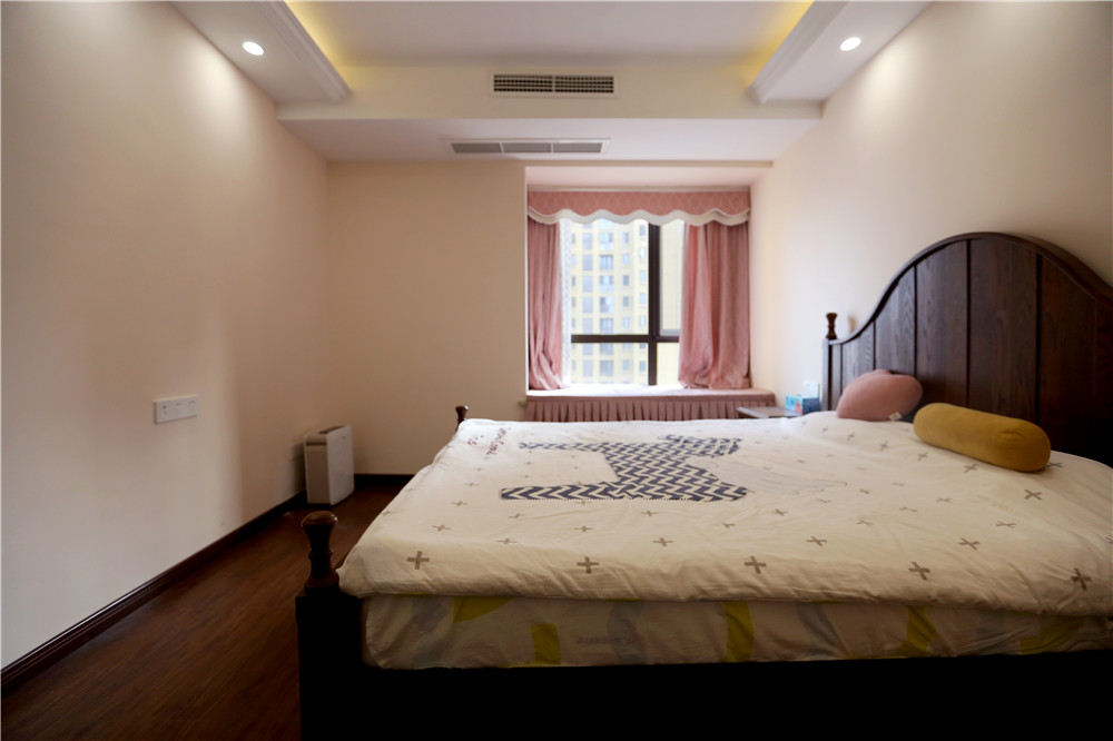 粉紅色窗簾與姜黃色乳膠漆搭配出暖色的感覺,在木質地板復古味道的襯托下,讓人沉浸在一種舒適放松的環境下。