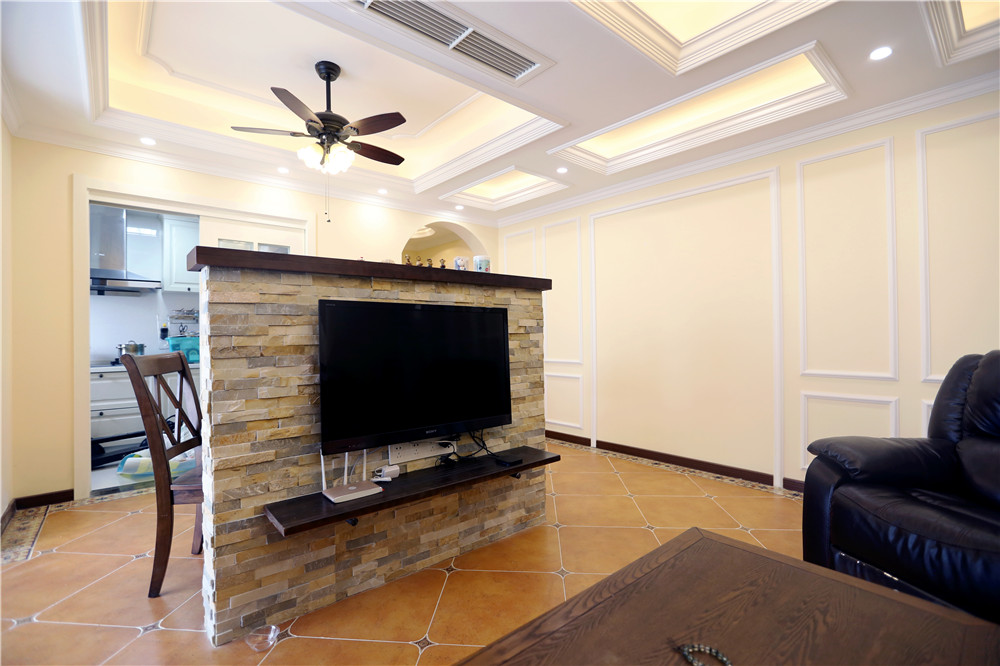 三五好友相聚,背倚“吧臺”,一邊吃著從廚房端上來的水果零食,一邊聊著過往。頭上的吊扇燈,一物兩用,讓古典和現代完美融合。