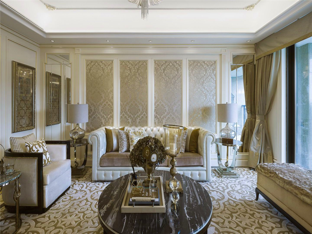 較為典型的歐式元素為實木線、裝飾柱、壁爐和鏡面等,地面一般鋪大理石,墻面貼花紋墻紙裝飾。室內布局多采用對稱的手法,以白、黃、金三色系為主。