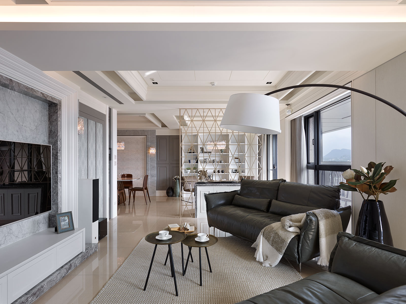 想營造大器奢華感的客廳氛圍,選擇大套沙發準沒錯!此案客廳裝修設計風格古典中帶有奢華感,在大空間客廳中想挑選一張能襯托客廳的沙發,幾經挑選后選擇集舒適與功能于一身的大L型沙發。皮革選用輕盈的大地色系,為客廳增添了溫馨飽和的感覺。