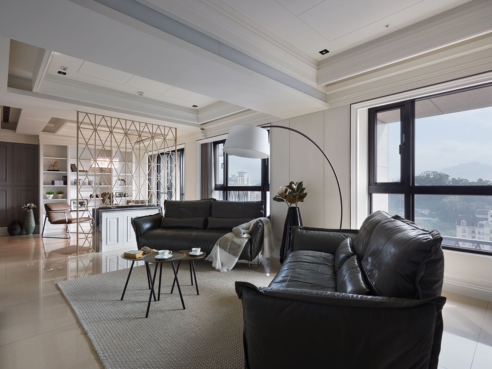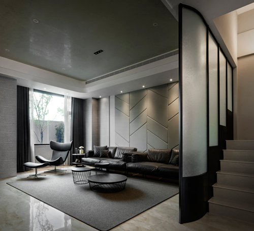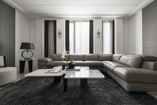 選擇的沙發擁有高背造型,側邊特殊的皮革設計,搭配輕巧極簡的底座線條,呈現出一種既雍容奢華又精悍俐落的沖突美感,能為空間塑造出極其鮮明的標記。